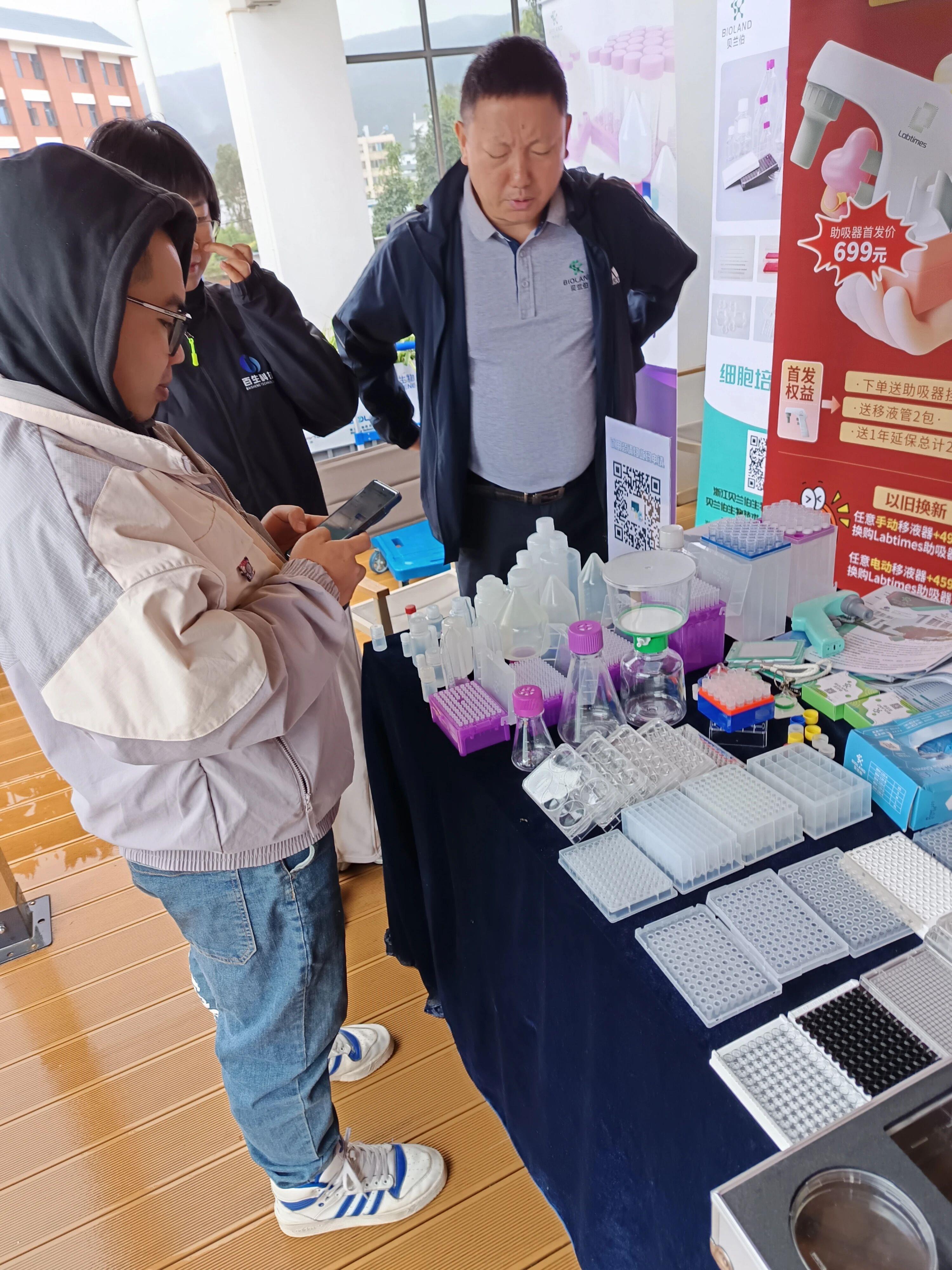 高校交流 · 走进科研核心在活动现场,贝兰伯与云南百生科技团队搭建展示台,展示了包括细胞培养、分子实验、样本存储、实验室耗材等多系列产品。前来咨询的老师与研究生络绎不绝,他们关心产品性能、试剂匹配,也分享着实验中的小故事与挑战。