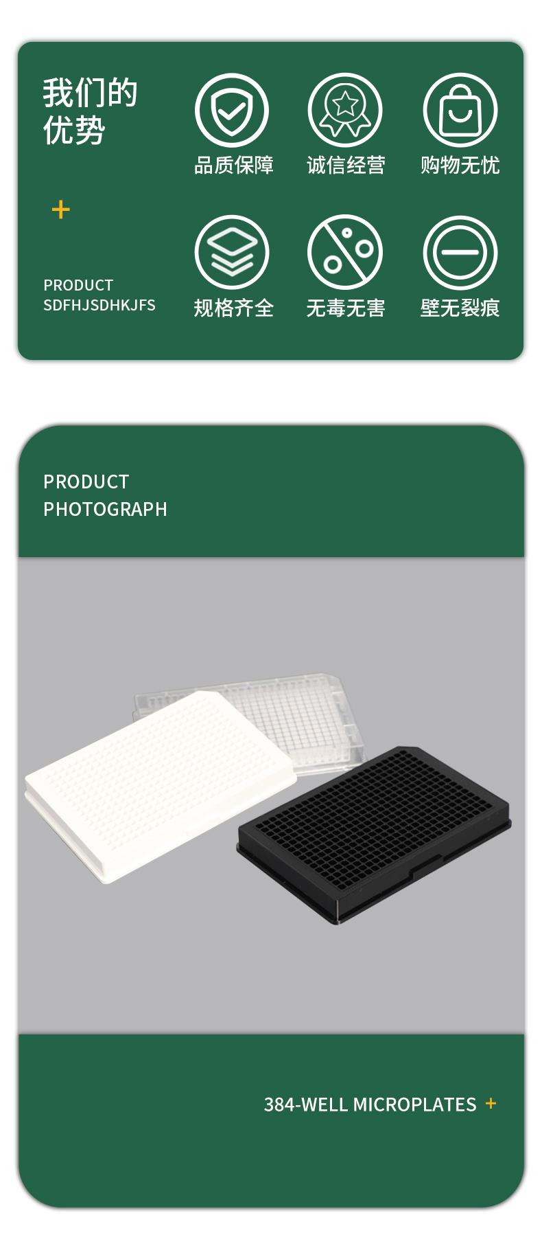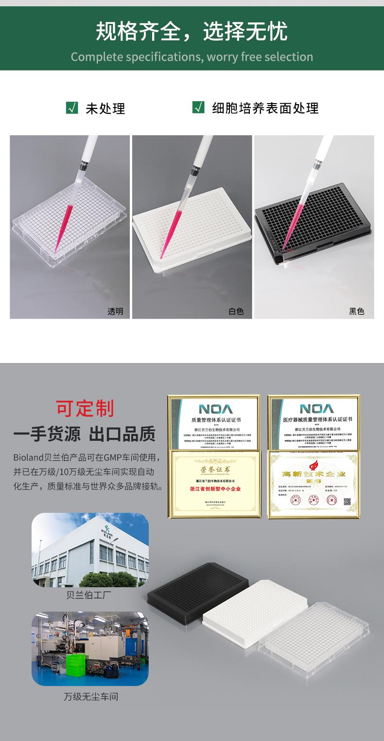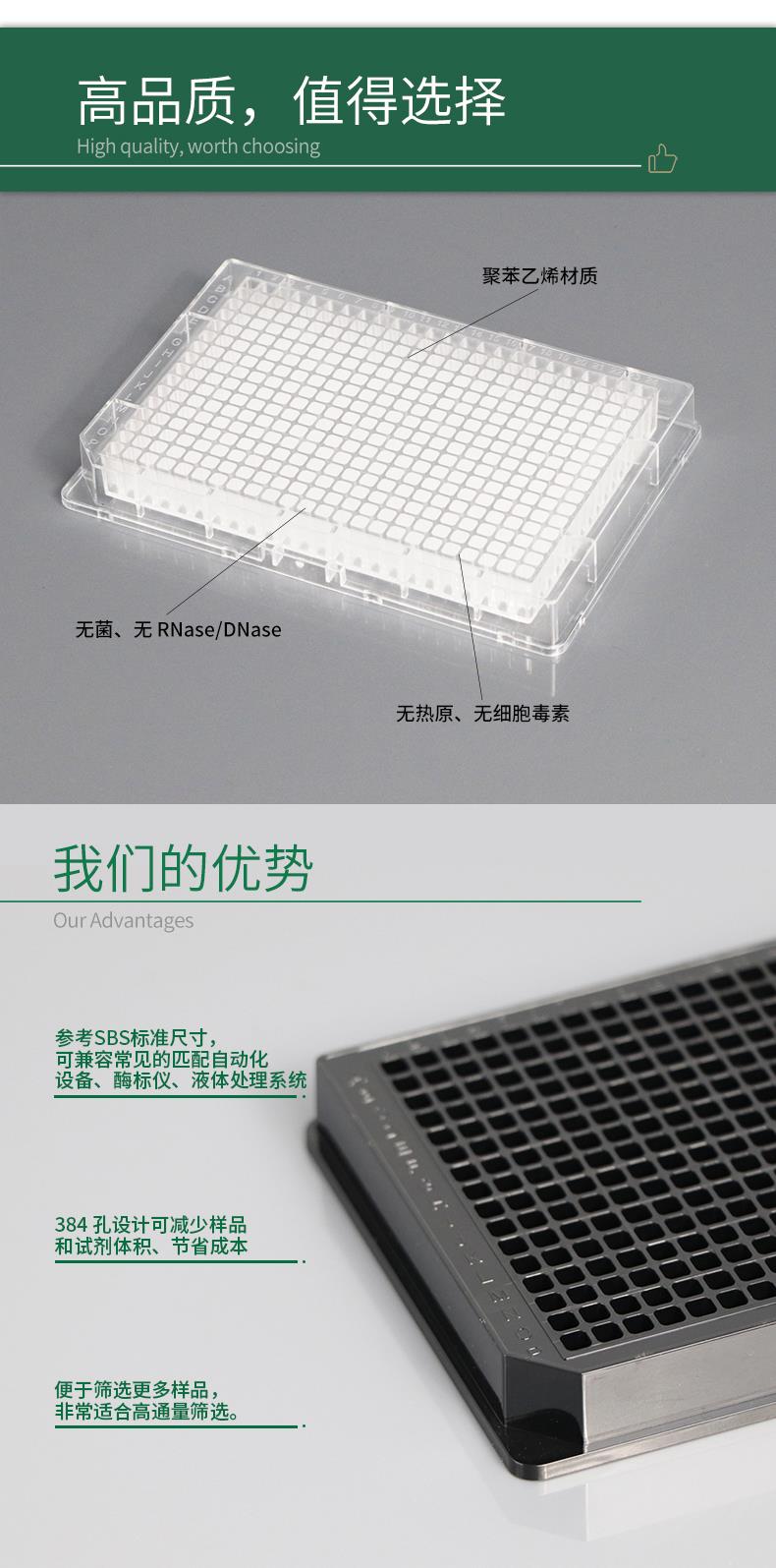 > 提供未处理和已通过细胞培养表面处理 2 种选择。参考 SBS 标准尺寸设计,可兼容匹配生命科学领域中常见自 动化设备、酶标仪、液体处理系统。384 孔设计可减少样品和试剂体积、节省成本,同时便于筛选更多样品, 非常适合高通量筛选。