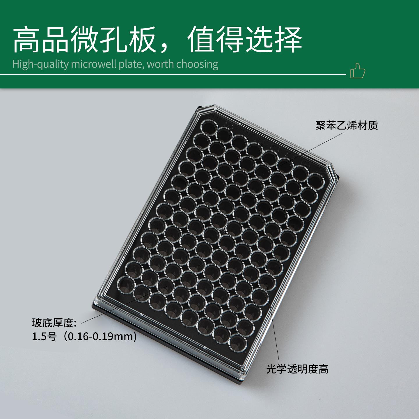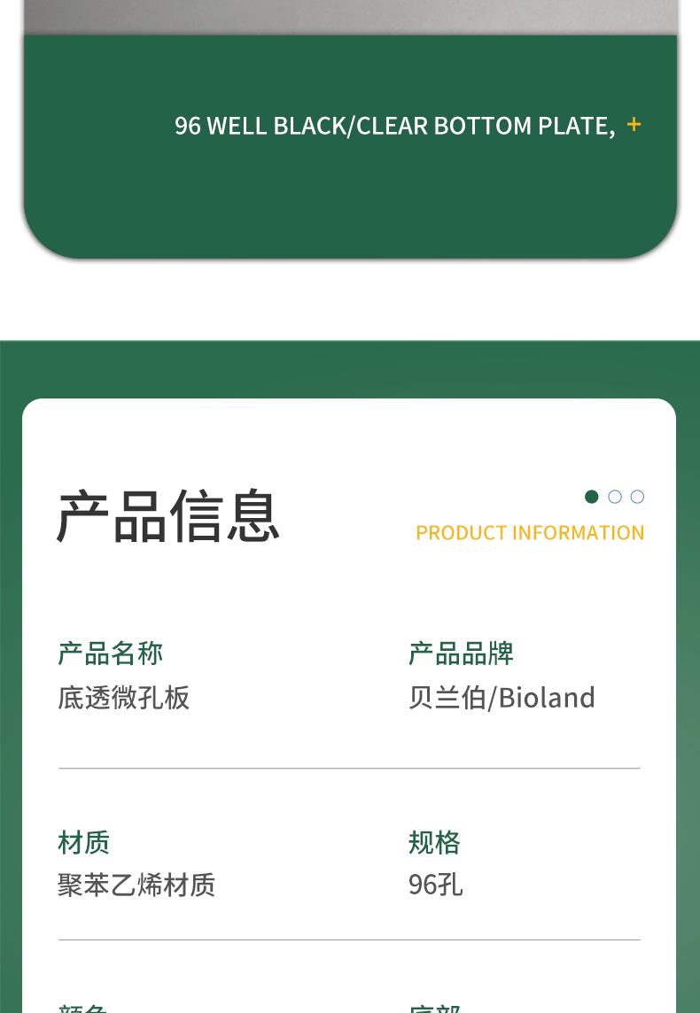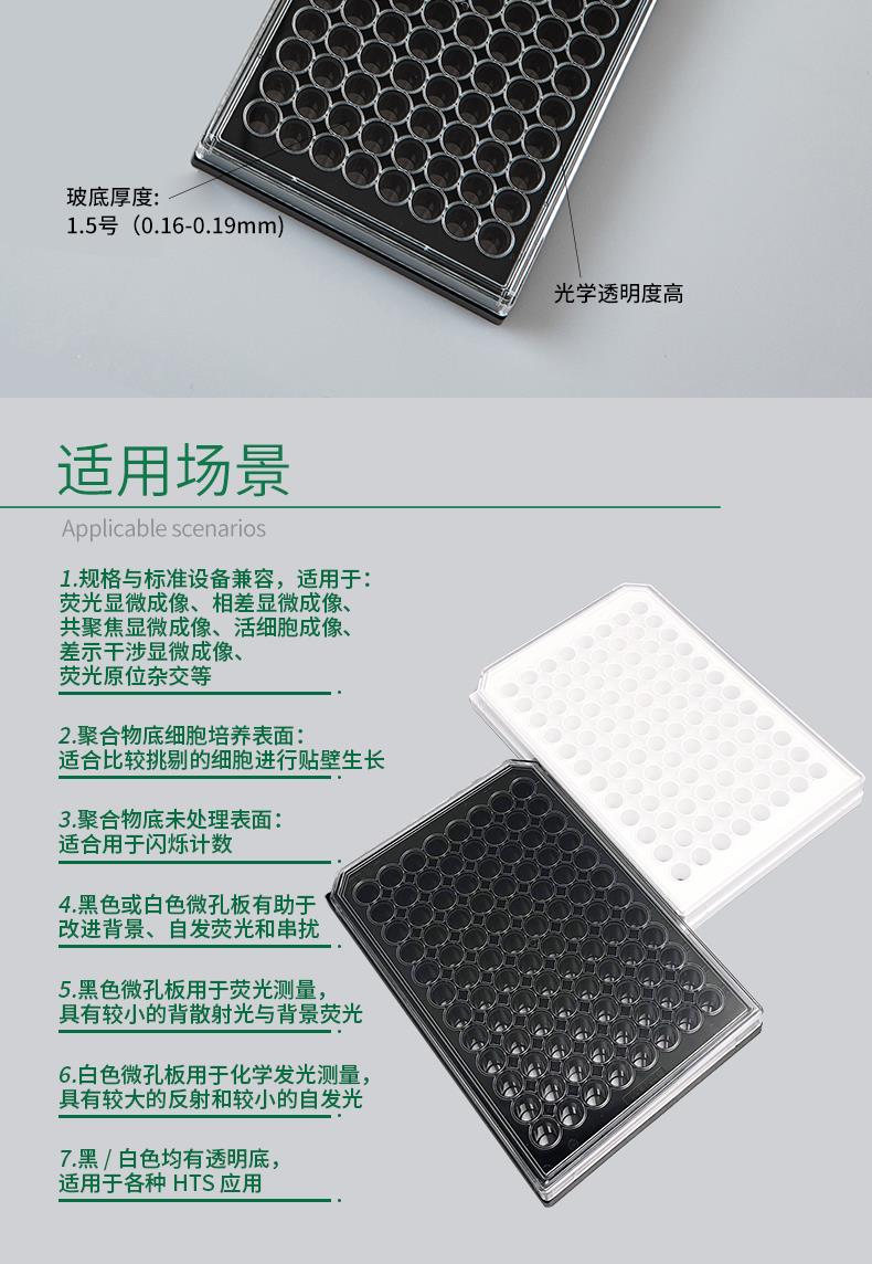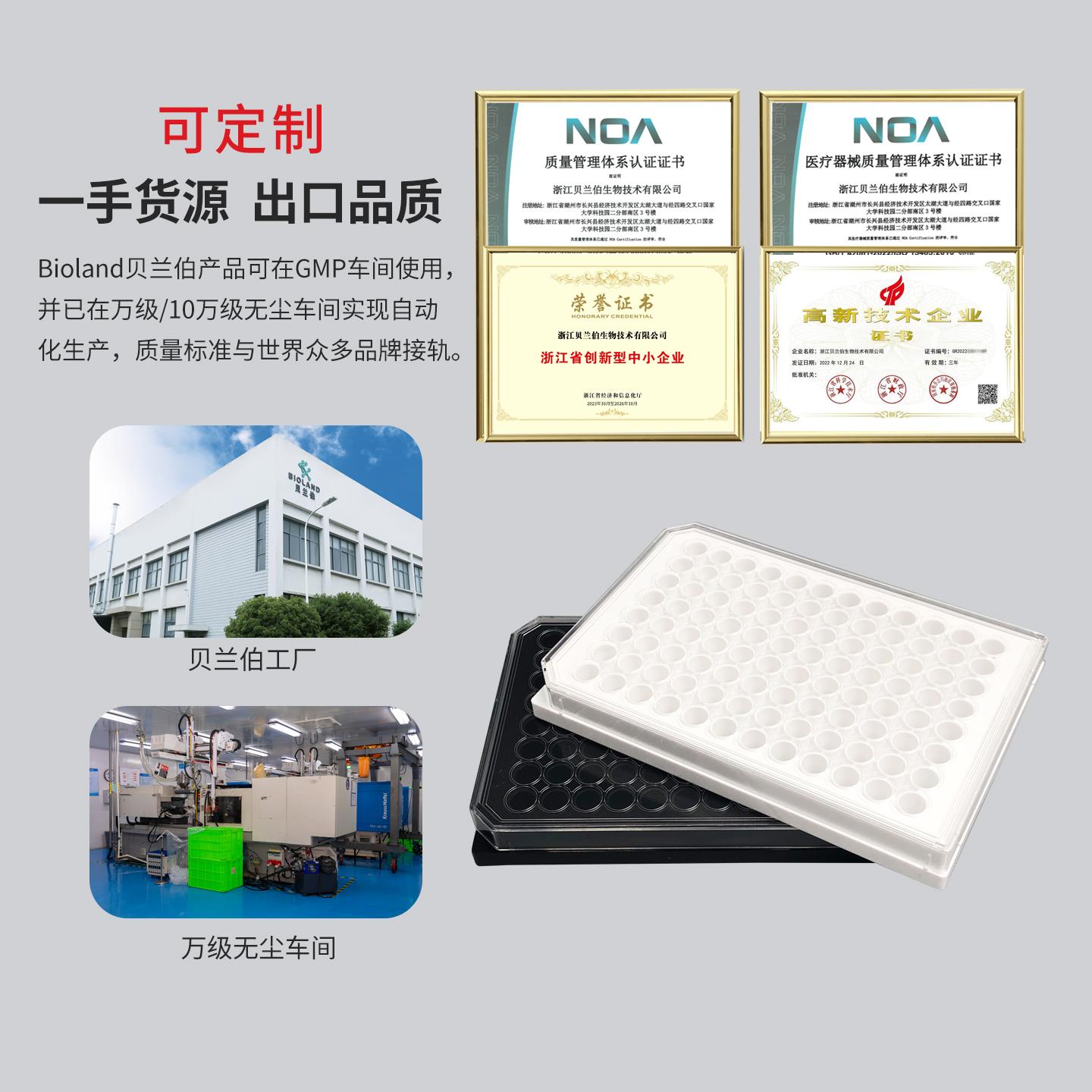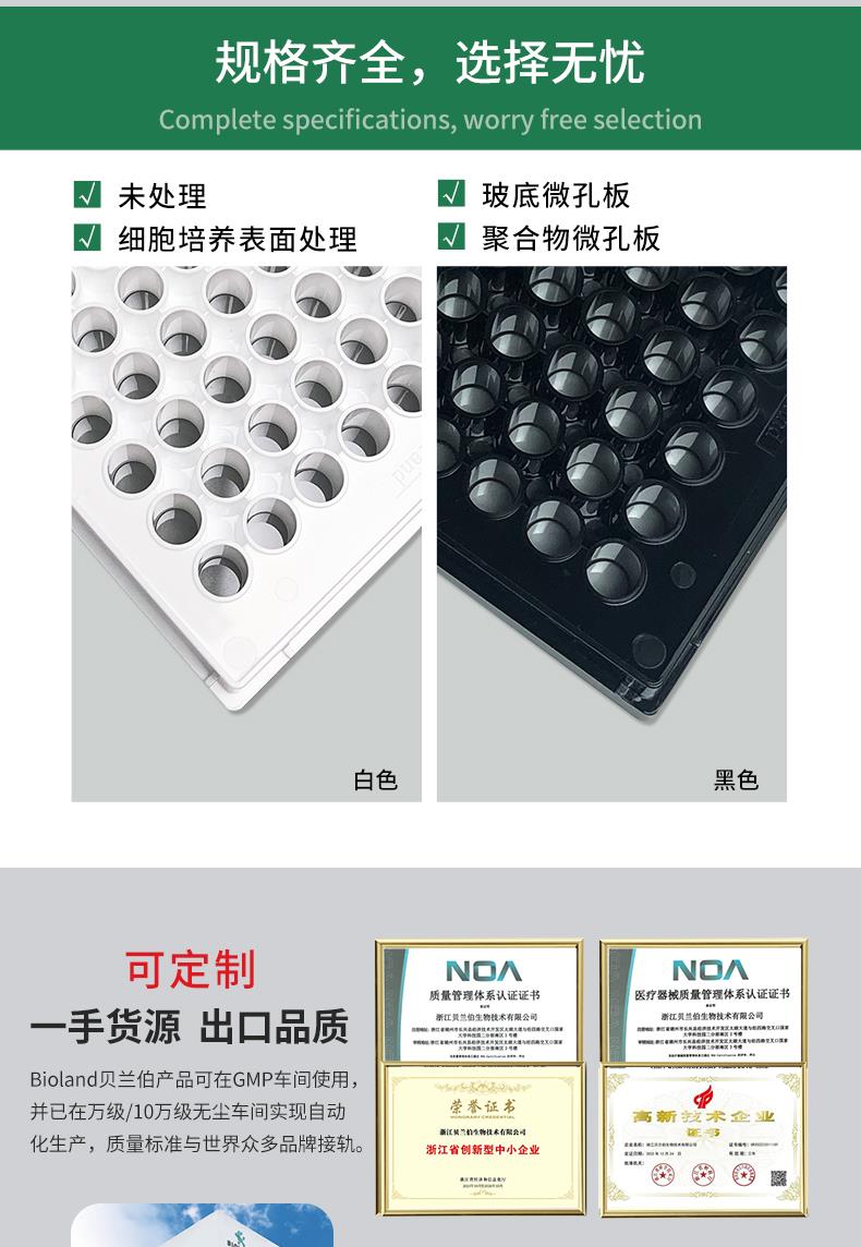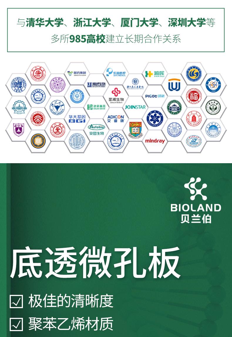 采用聚苯乙烯黑色或白色上部结构及薄层聚苯乙烯板底的 Bioland 底透微孔板可实现细胞培养和显微镜检测应用中极佳的荧光和化学发光检测性能;