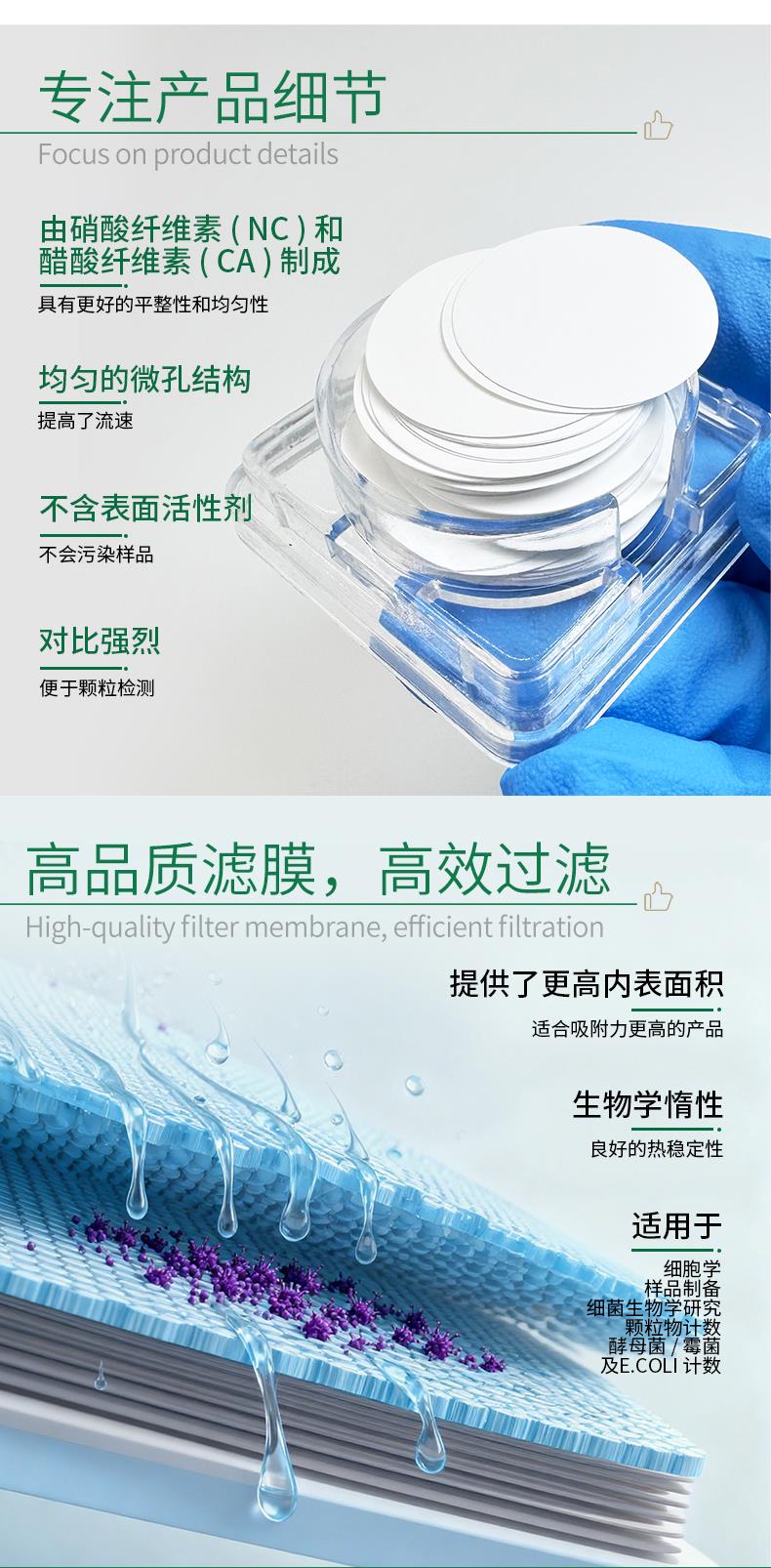 为检测颗粒物和微生物提供了更好的对比,减少了眼睛疲劳。混合纤维素膜在要求更高流速和 更大过滤容量的应用中非常有效。